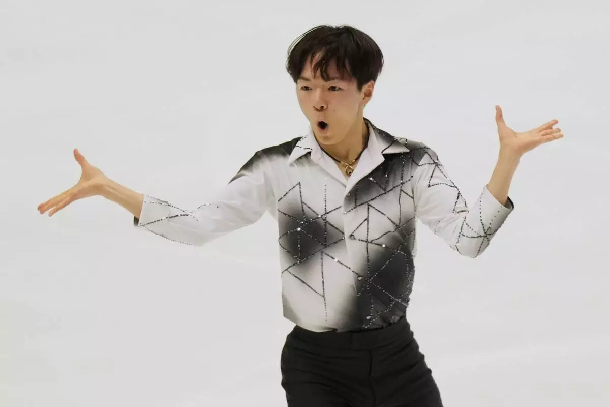 Yuma Kagiyama of Japan reacts during the men's short program at the ISU Grand Prix of Figure Skating - NHK Trophy in Kadoma, east of Osaka, western Japan, Friday, Nov. 7, 2025. (AP Photo/Hiro Komae)