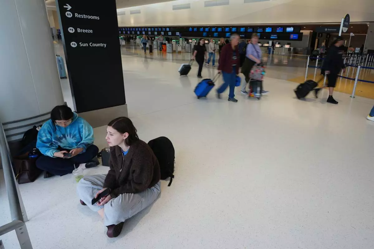 Grace Theodore, below center, and Isabel Azucena sit in a terminal at San Diego International Airport after learning their flight to New York was delayed by three hours Saturday, Nov. 8, 2025, in San Diego. (AP Photo/Gregory Bull)