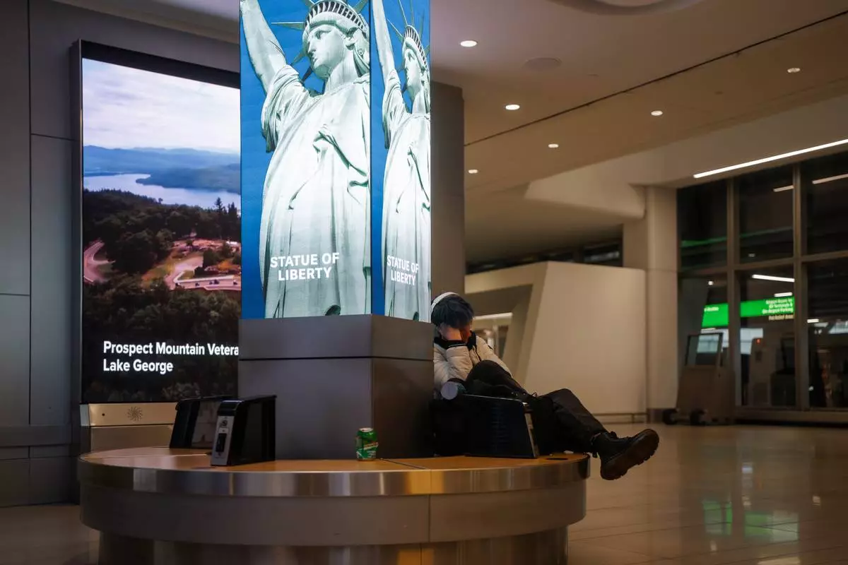 A traveler sleeps at Laguardia International Terminal on Saturday, Nov. 8, 2025, in New York. (AP Photo/Olga Fedorova)