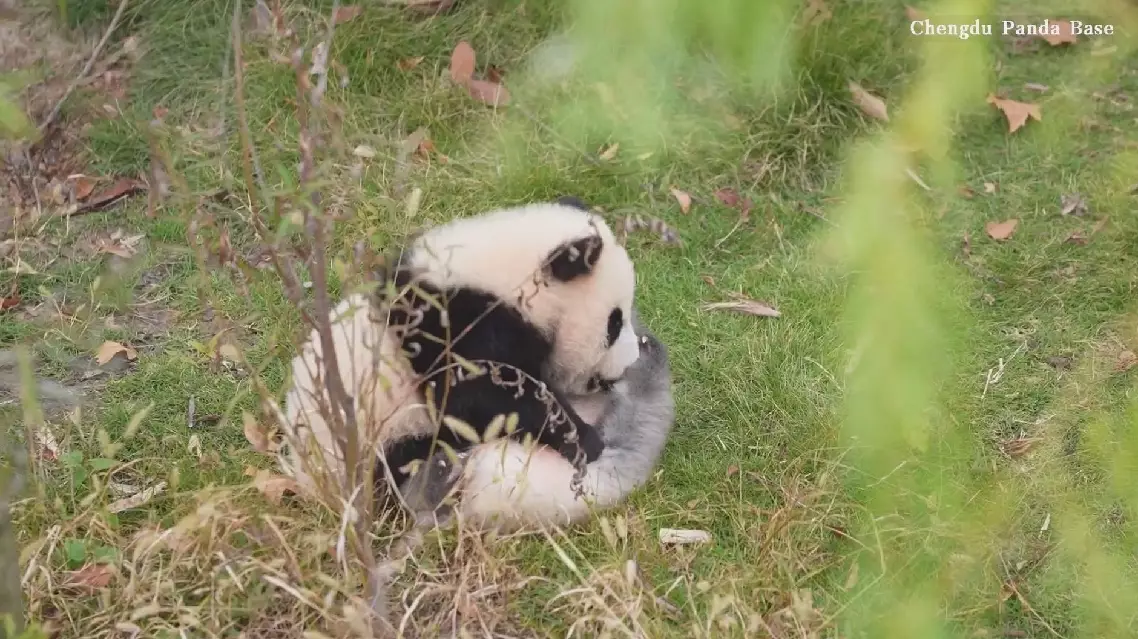 The young fluffy cub was lying on its back on the grass at the Star Giant Panda Nursery House in the Chengdu Research Base of Giant Panda Breeding on Oct. 16 when the old one made several attempts to pull it up but failed.