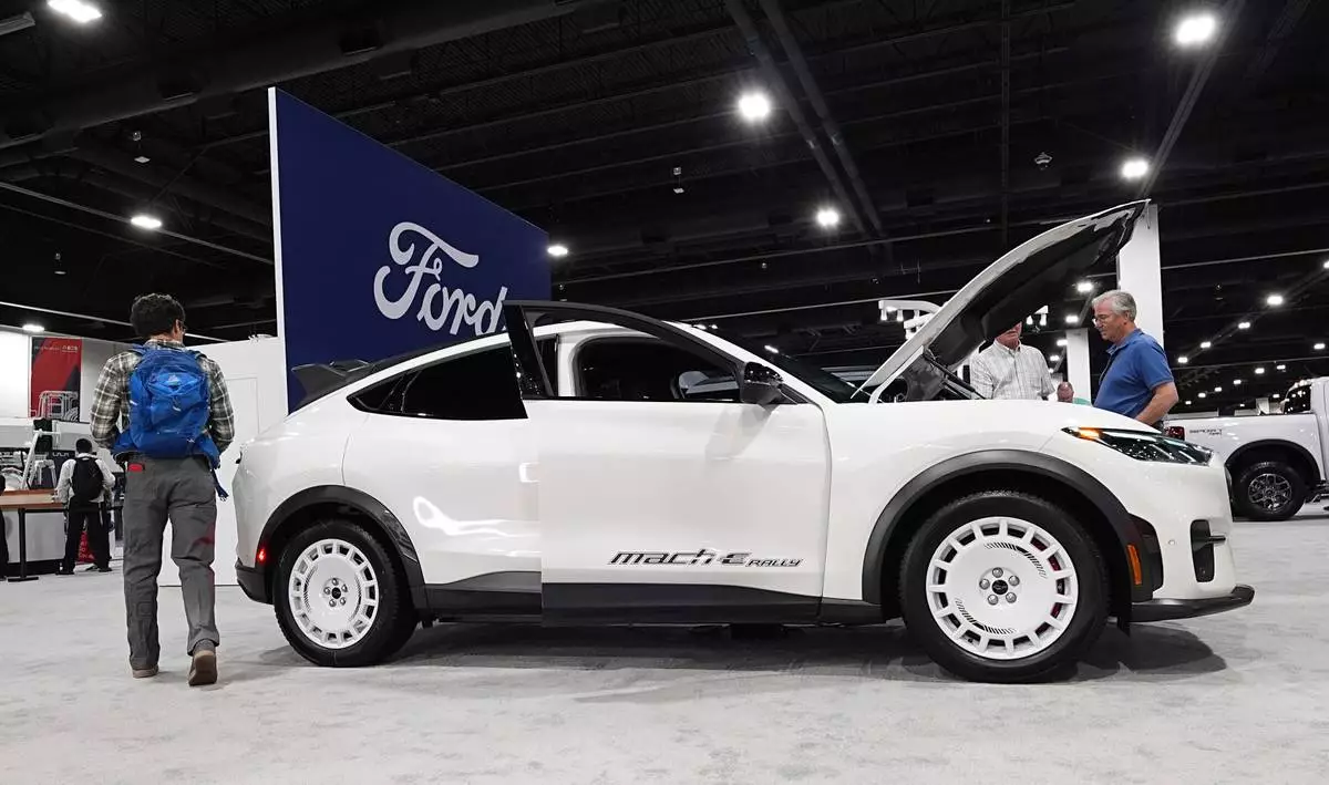 FILE - Shoppers look over a 2025 Mach-E electric utility vehicle in the Ford display at the Colorado Auto Show, April 17, 2025, in Denver. (AP Photo/David Zalubowski, File)