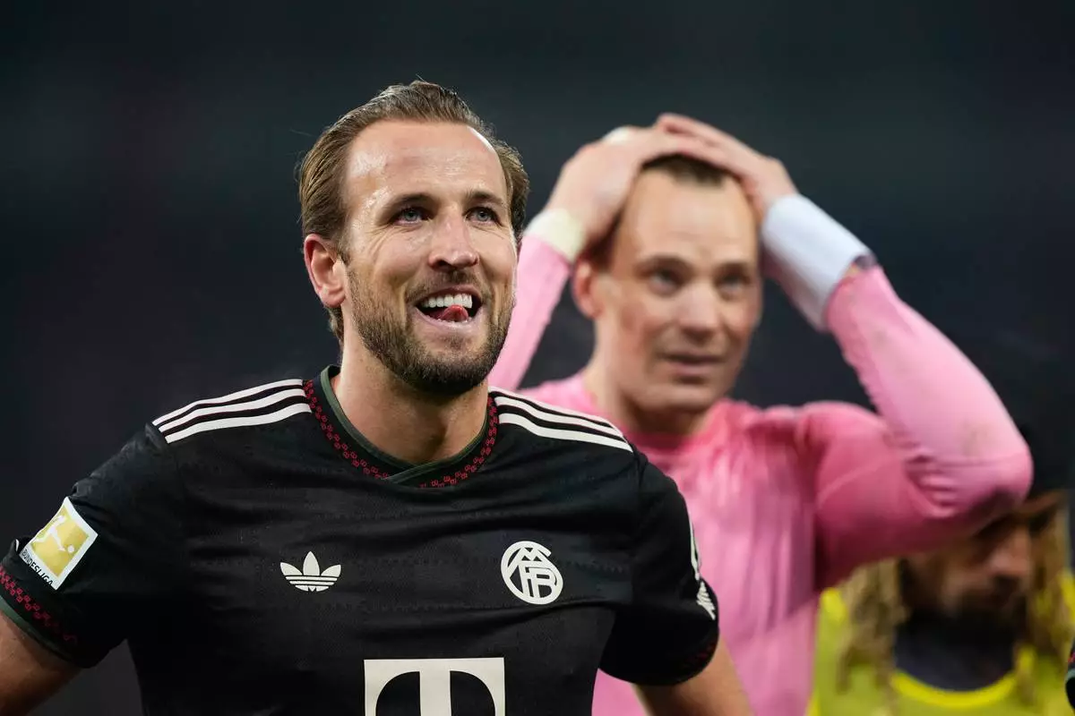 Bayern's Harry Kane reacts besides goalkeeper Manuel Neuer after the Bundesliga soccer match between Union Berlin and FC Bayern Munich in Berlin, Germany, Saturday, Nov. 8, 2025. (AP Photo/Martin Meissner)