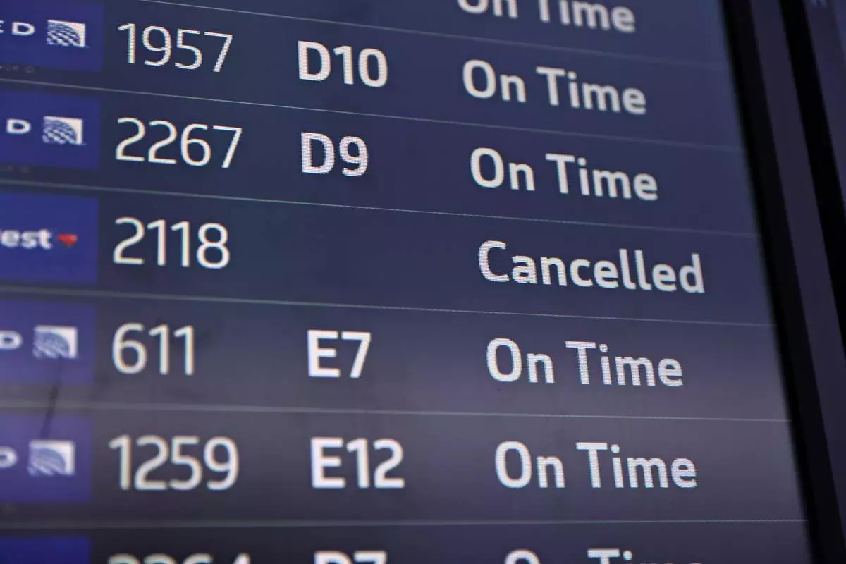 Flights are displayed at San Francisco International Airport on Friday, Nov. 7, 2025. (Gabrielle Lurie /San Francisco Chronicle via AP)