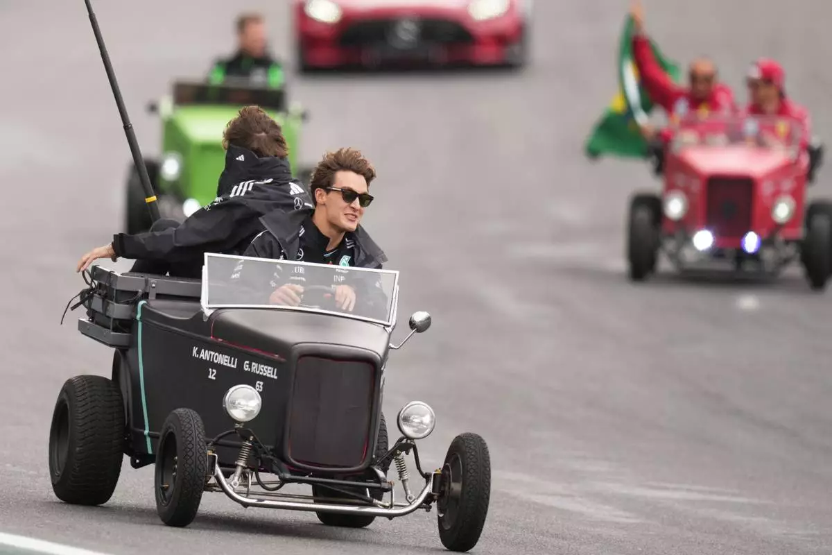Mercedes driver George Russell of Britain drives during the opening parade at the Brazilian Formula One Grand Prix at the Interlagos race track in Sao Paulo, Sunday, Nov. 9, 2025. (AP Photo/Andre Penner)