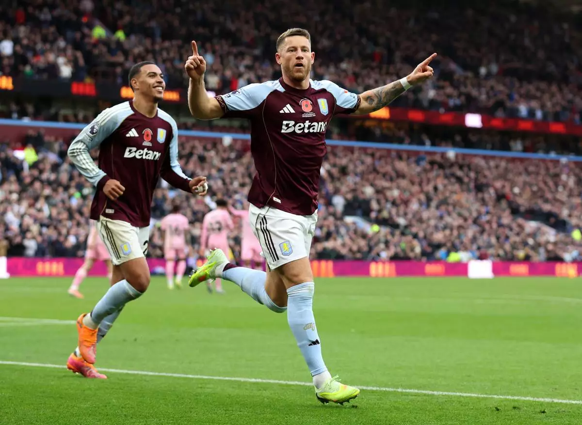 Aston Villa's Ross Barkley celebrates scoring their side's third goal of the game during the English Premier League soccer match between Aston Villa and AFC Bournemouth in Birmingham, Sunday, Nov. 9, 2025. (Nigel French/PA via AP)