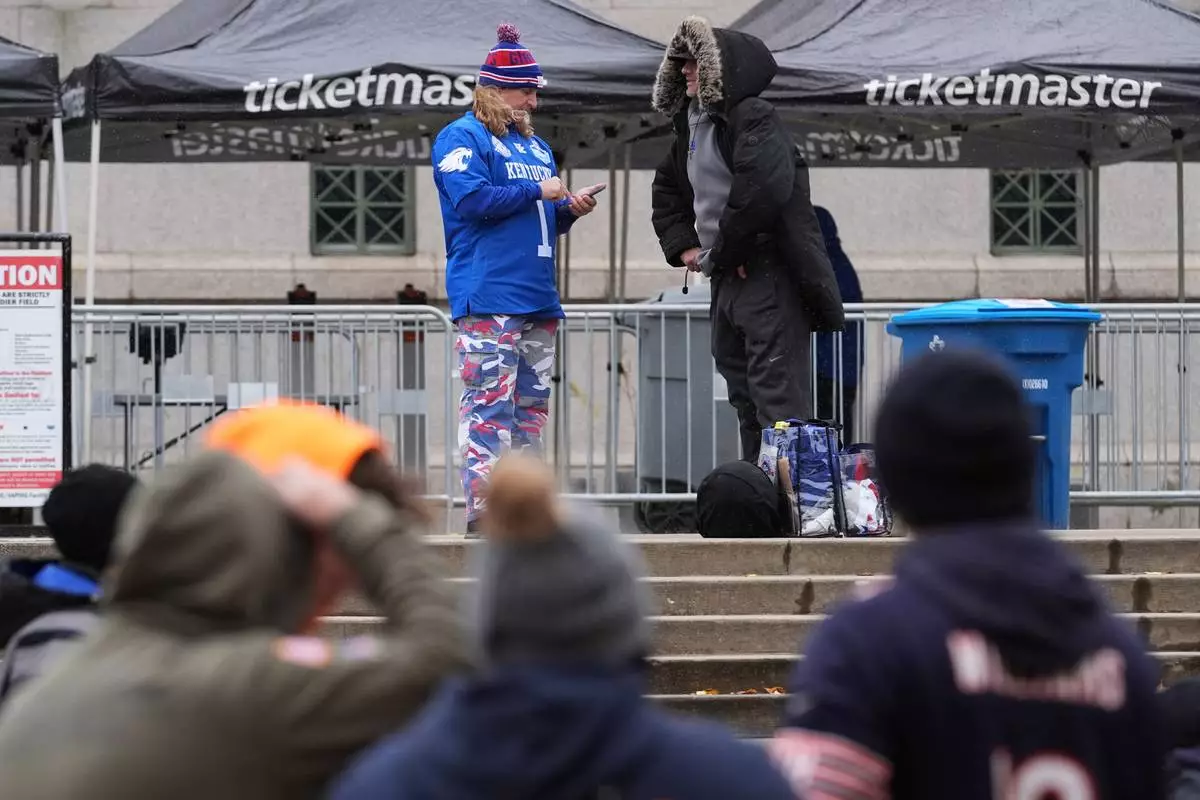 Fans bundle up before an NFL football game between the New York Giants and the Chicago Bears in Chicago, Sunday, Nov. 9, 2025. (AP Photo/Nam Y. Huh)