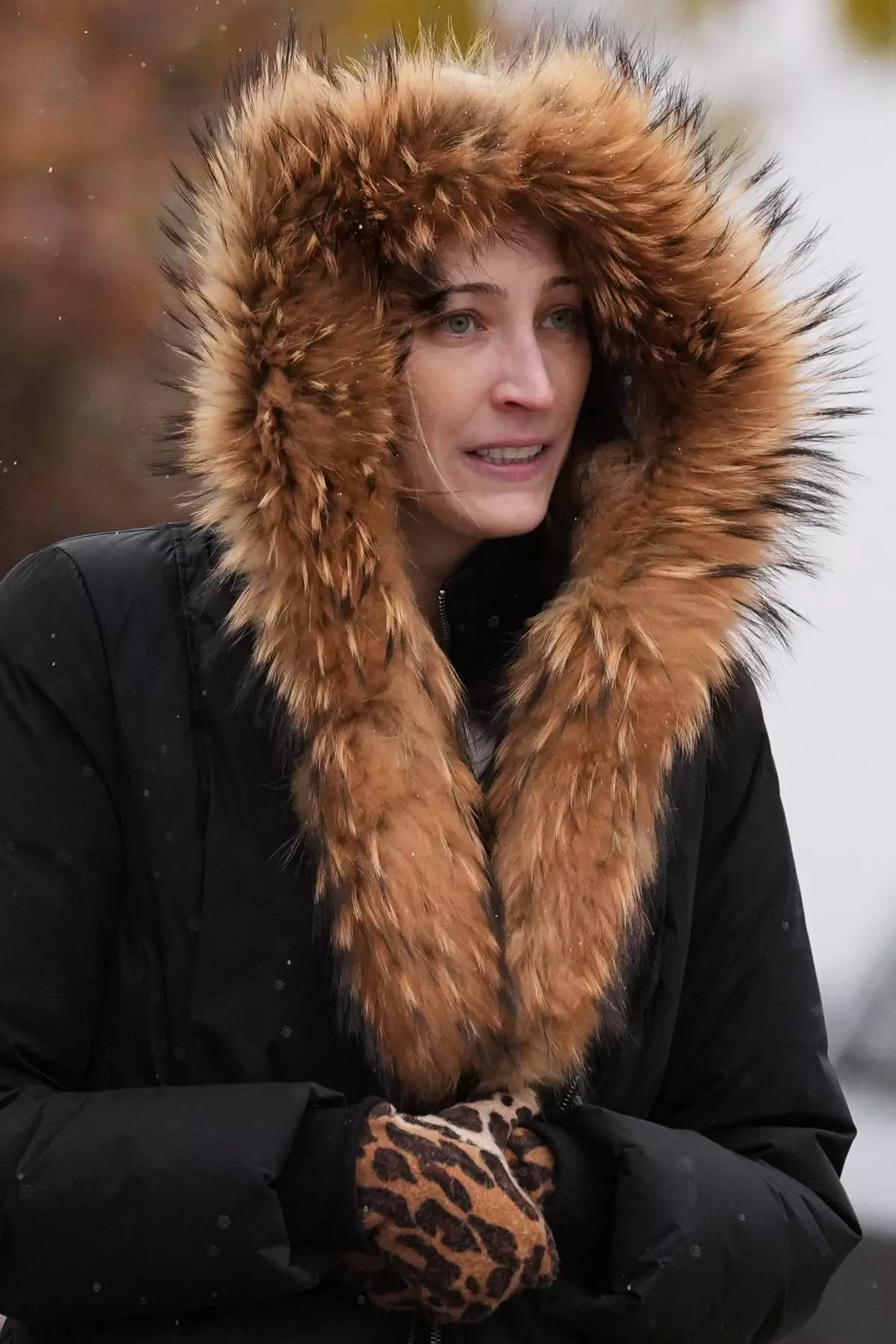 A pedestrian bundles up as she takes a walk with her dog during a snowy day in Northbrook, Ill., Sunday, Nov. 9, 2025. (AP Photo/Nam Y. Huh)