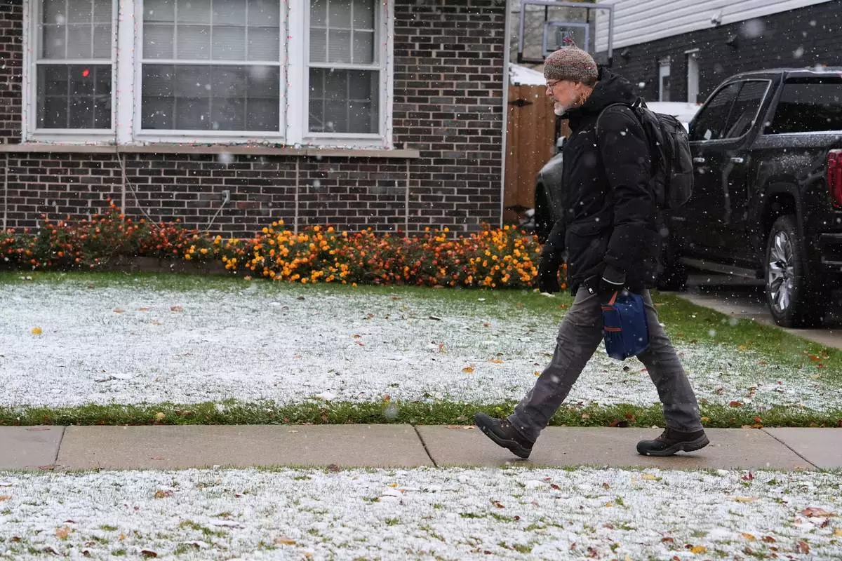 Pedestrian walks on the sidewalk during a snowy day in Skokie, Ill., Sunday, Nov. 9, 2025. (AP Photo/Nam Y. Huh)