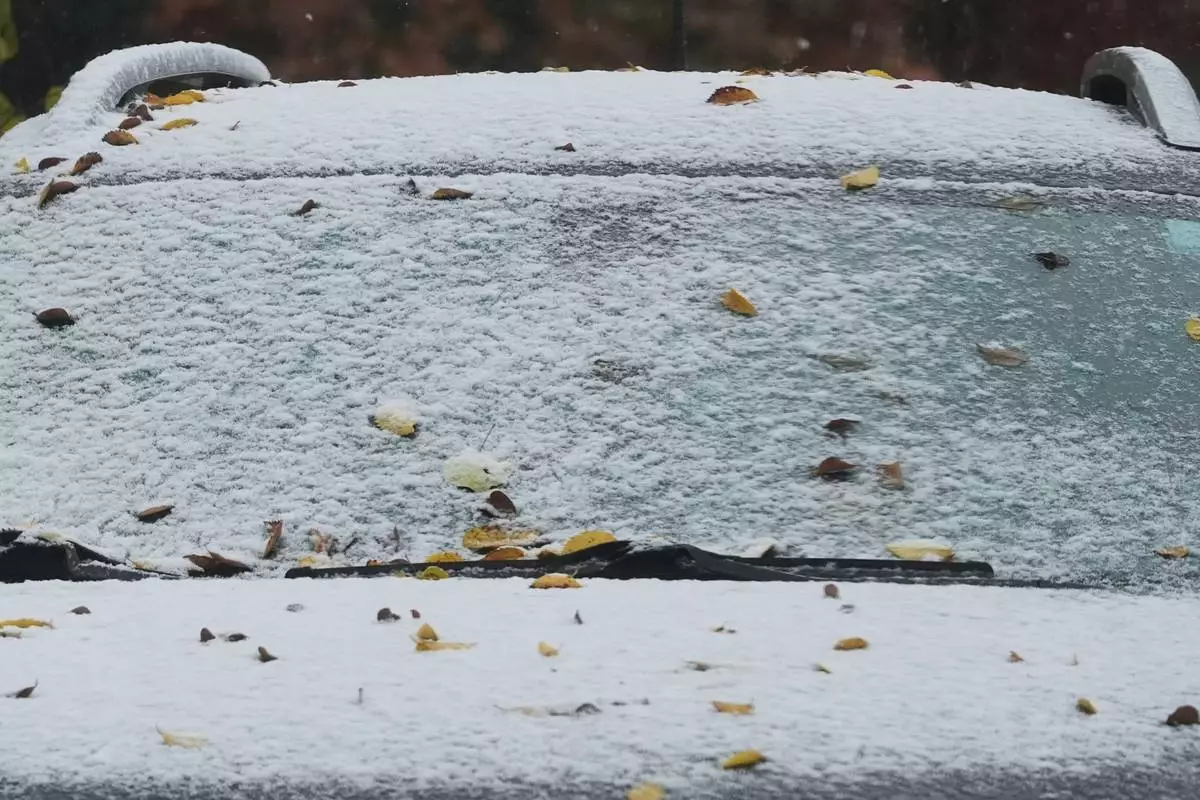 A car is covered with snow during a cold day in Evanston, Ill., Sunday, Nov. 9, 2025. (AP Photo/Nam Y. Huh)