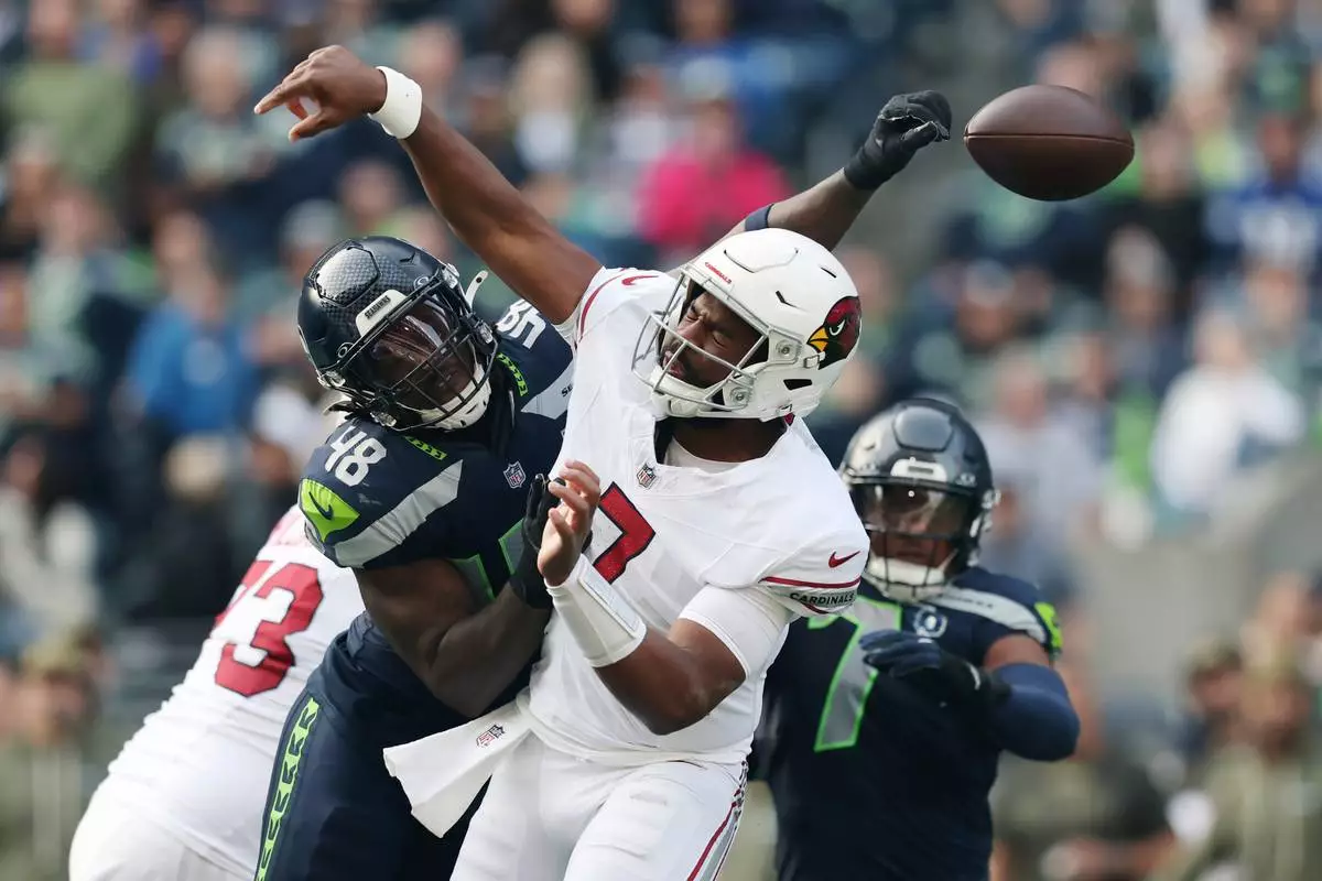 Seattle Seahawks linebacker Tyrice Knight (48) causes a fumble by Arizona Cardinals quarterback Jacoby Brissett, right, during the first half of an NFL football game Sunday, Nov. 9, 2025, in Seattle. (AP Photo/Maddy Grassy)
