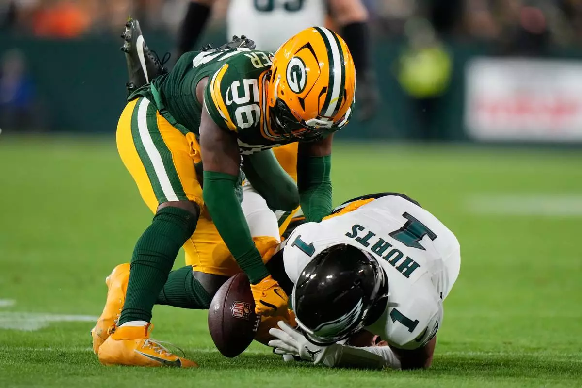 Green Bay Packers linebacker Edgerrin Cooper, left, and Green Bay Packers safety Xavier McKinney (29) tackle Philadelphia Eagles quarterback Jalen Hurts (1) as he fumbles during the first half of an NFL football game Monday, Nov. 10, 2025, in Green Bay, Wis. (AP Photo/Morry Gash)