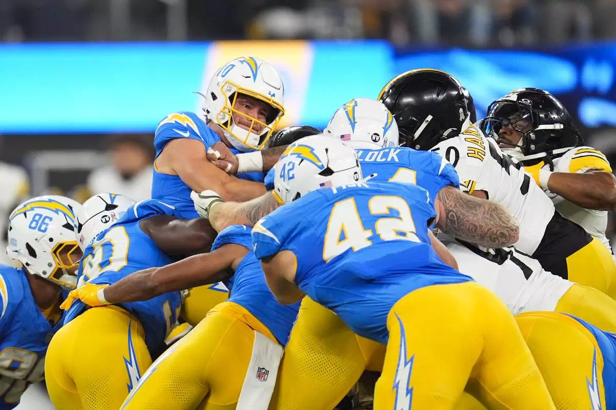 Los Angeles Chargers quarterback Justin Herbert, top left, is stopped by Pittsburgh Steelers players during the first half of an NFL football game Sunday, Nov. 9, 2025, in Inglewood, Calif. (AP Photo/Marcio Jose Sanchez)