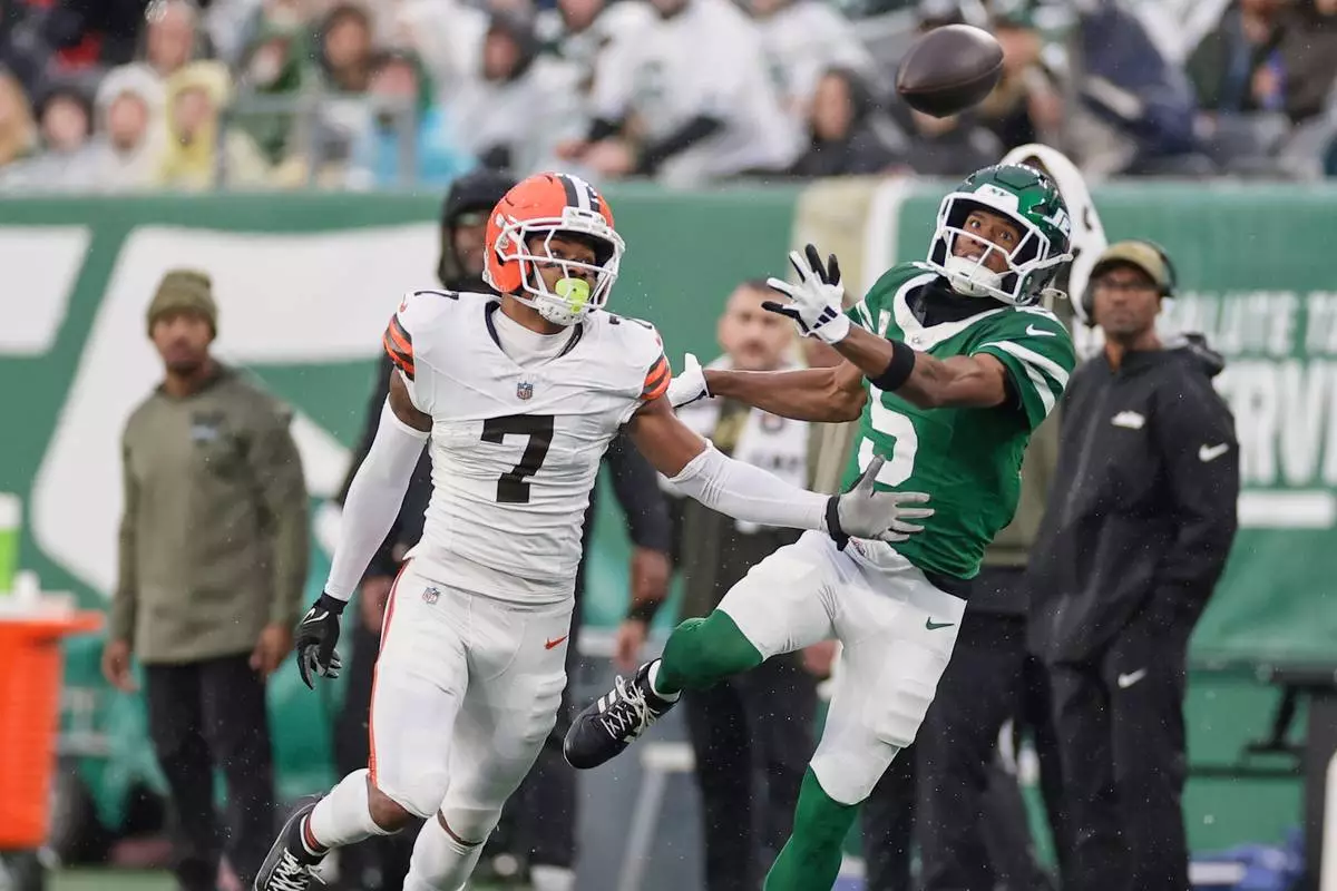 Cleveland Browns cornerback Tyson Campbell (7) and New York Jets wide receiver Garrett Wilson (5) watch the ball on an incomplete pass in the second half of an NFL football game, Sunday, Nov. 9, 2025, in East Rutherford, N.J. (AP Photo/Adam Hunger)