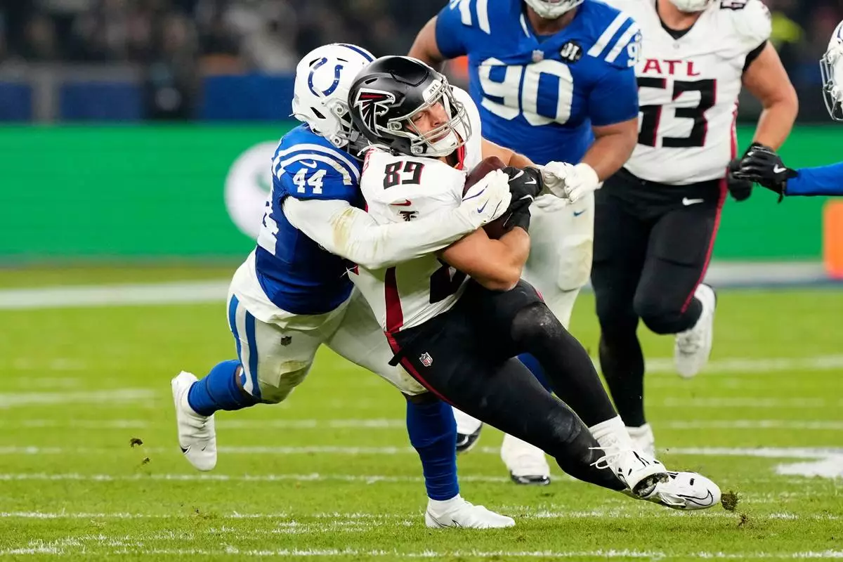 Atlanta Falcons tight end Charlie Woerner (89) is tackled by Indianapolis Colts linebacker Zaire Franklin (44) after catching a pass during the first half of an NFL football game, Sunday, Nov. 9, 2025, in Berlin, Germany. (AP Photo/Martin Meissner)