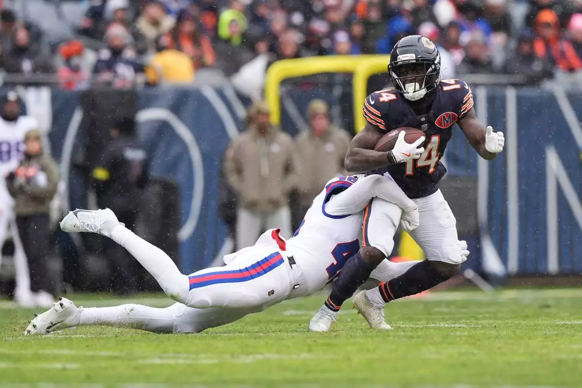 Chicago Bears wide receiver Olamide Zaccheaus (14) is tackled by New York Giants linebacker Zaire Barnes during the first half of an NFL football game Sunday, Nov. 9, 2025, in Chicago. (AP Photo/Nam Y. Huh)