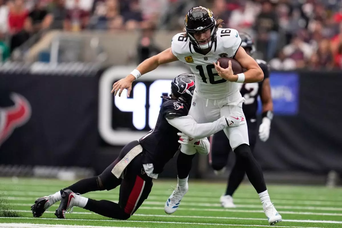 Houston Texans cornerback Tremon Smith (11) tackles Jacksonville Jaguars quarterback Trevor Lawrence (16) during an NFL football game, Sunday, Nov. 9, 2025, in Houston. (AP Photo/Ashley Landis)