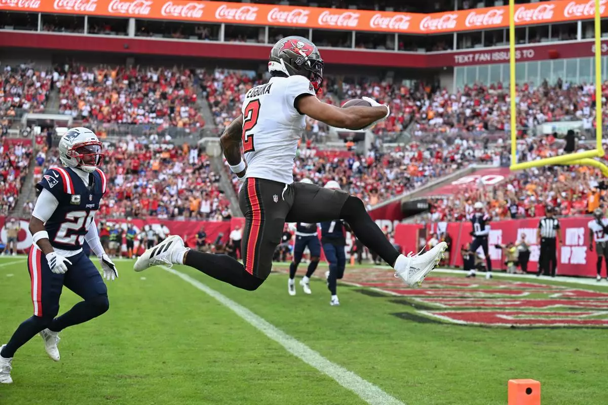 Tampa Bay Buccaneers wide receiver Emeka Egbuka (2) scores a touchdown against the New England Patriots during the first half of an NFL football game Sunday, Nov. 9, 2025, in Tampa, Fla. (AP Photo/Jason Behnken)
