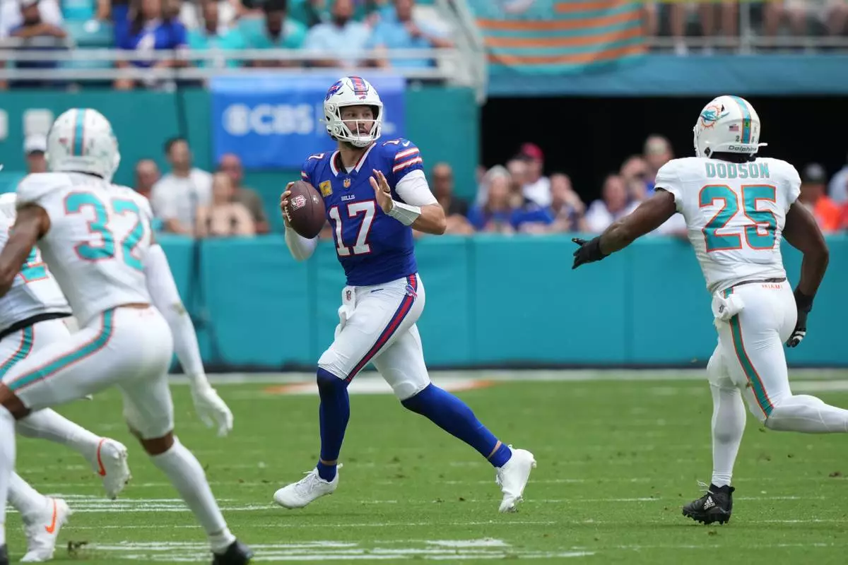 Josh Allen threw for 306 yards and two touchdowns, with an interception and fumble, but was replaced by Mitchell Trubisky after Achane's second TD put the Dolphins up by 17 with three minutes left.