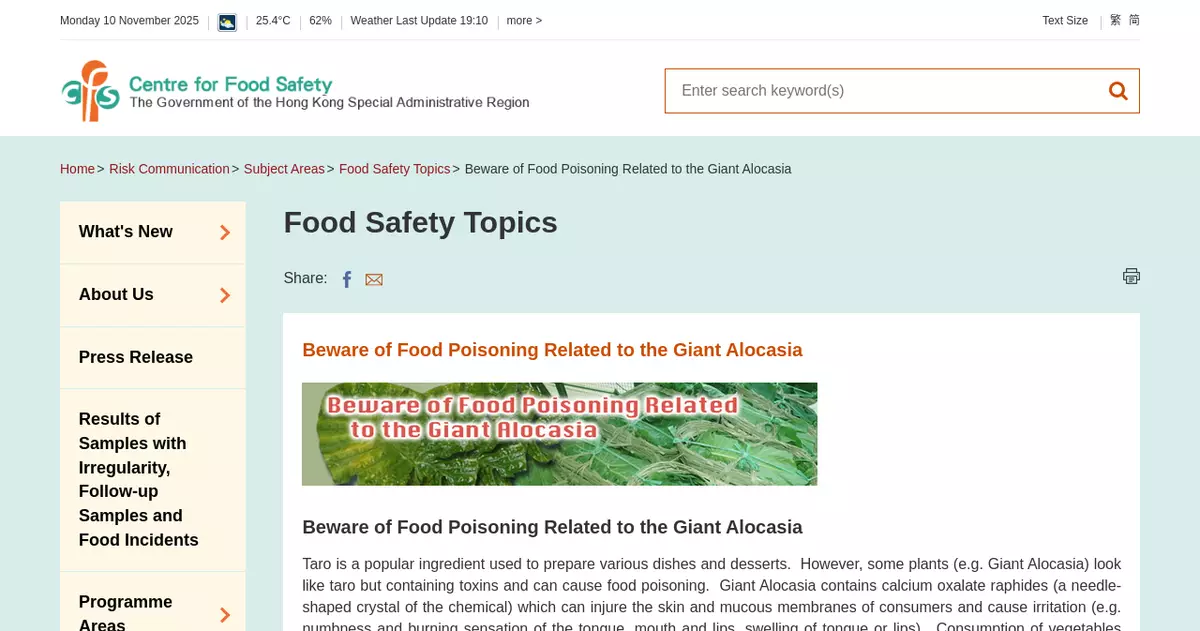The public may visit the pages onFood Poisoning Related to the Giant AlocasiaandCalcium Oxalate Food Poisoningof the Centre for Food Safety of the Food and Environmental Hygiene Department for more information and health advice.