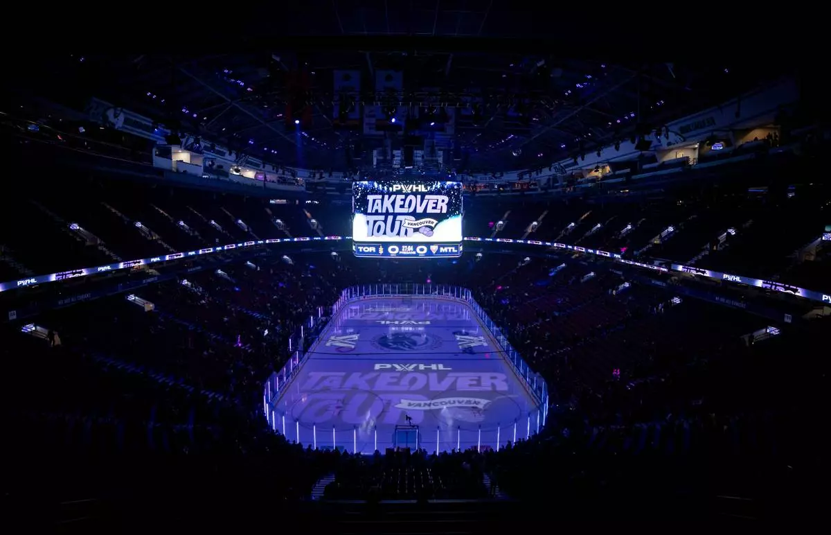 FILE - Fans gather to watch the Montreal Victoire and the Toronto Sceptres warm up before a PWHL hockey game in Vancouver, Wednesday, Jan. 8, 2025. (Ethan Cairns/The Canadian Press via AP, File)
