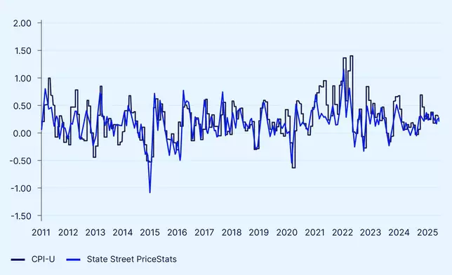 State Street PriceStats -- US Daily Inflation Index and BLS US Consumer Price Index (monthly rate in %, 2011-2025)