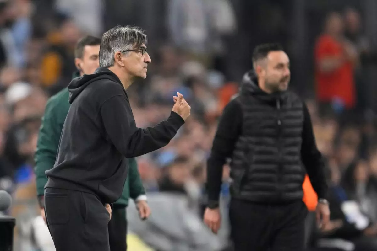 Atalanta's head coach Ivan Juric, left, reacts during the Champions League opening phase soccer match between Marseille and Atalanta in Marseille, France, Wednesday, Nov. 5, 2025. (AP Photo/Philippe Magoni)