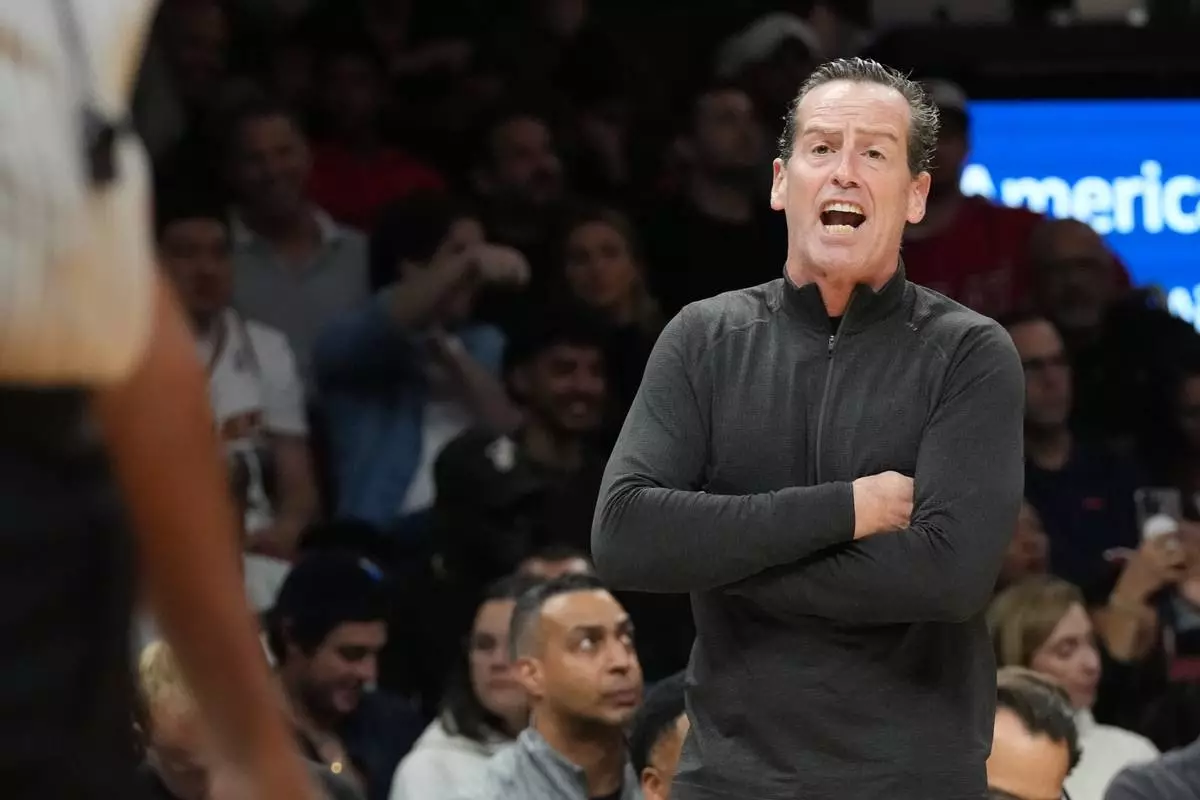 Cleveland Cavaliers head coach Kenny Atkinson reacts after he is charged with a technical foul during the first half of an NBA basketball game against the Miami Heat Monday, Nov. 10, 2025, in Miami. (AP Photo/Marta Lavandier)