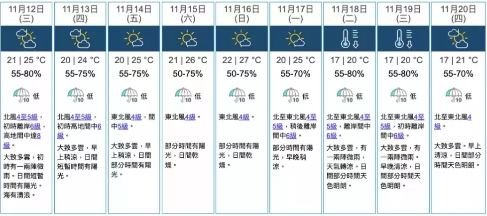 The observatory said that Fung-Wong has weakened slightly over the past few hours. It is expected that the chance of strong winds persisting in most areas of Hong Kong on Tuesday is low, and the Standby Signal No. 1 will remain in effect during the day on Tuesday. Besides, the outer rainbands of Fung-Wong are gradually approaching the area of the Pearl River Estuary, which is expected to bring one or two showers of light rain to Hong Kong.