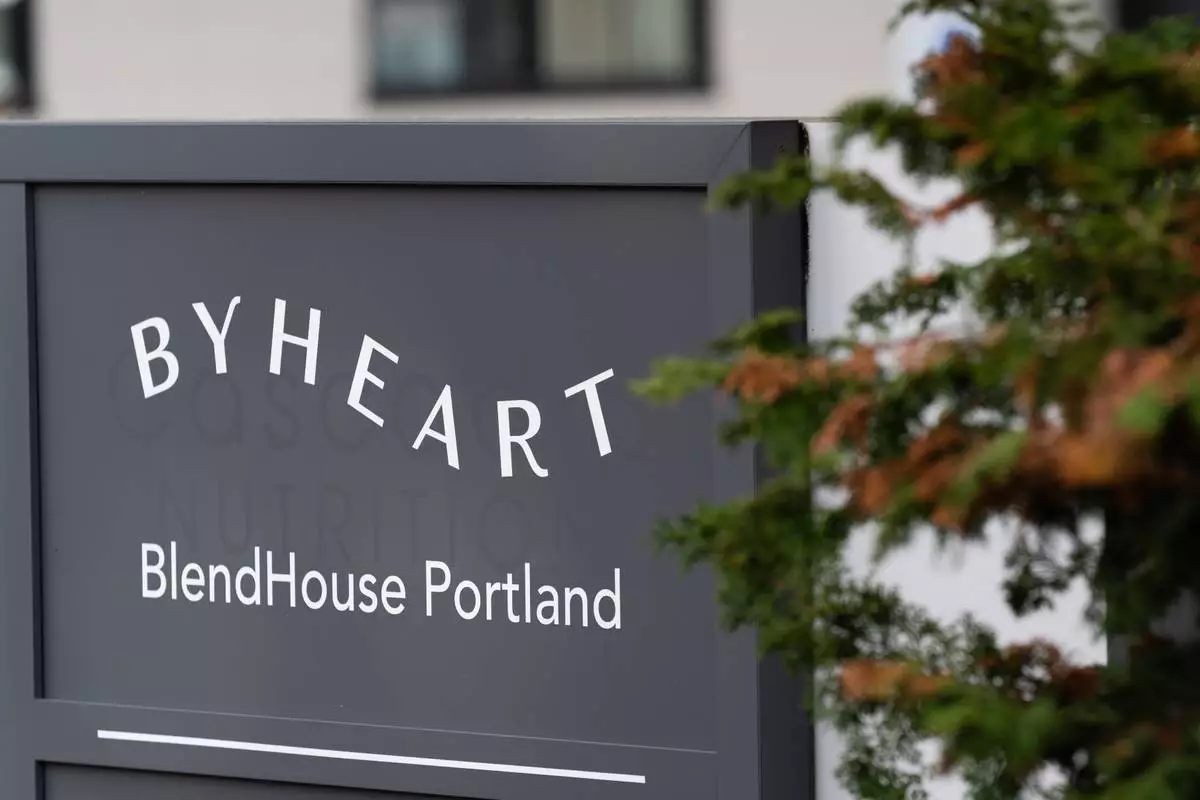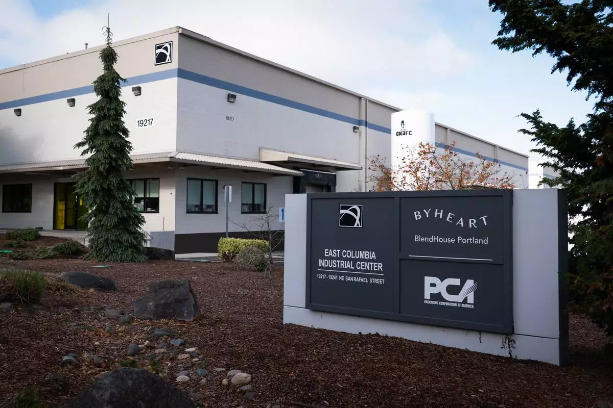 A sign for ByHeart, a manufacturer of organic baby formula, is displayed outside a building that houses a plant for the company on Tuesday, Nov. 11, 2025, in Portland, Ore. (AP Photo/Jenny Kane)