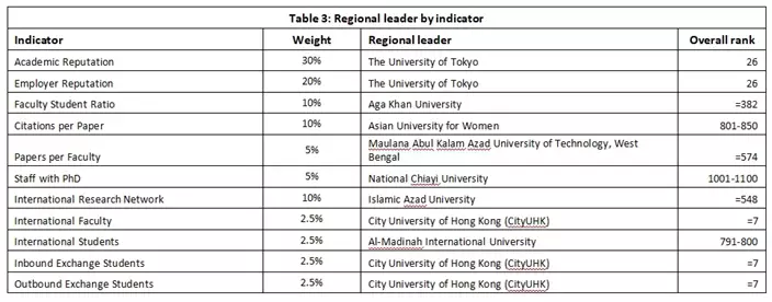 Table 5 below shows that Hong Kong’s average performance across all indicators far exceeds regional benchmarks. The table includes only those countries and territories with five or more ranked institutions.