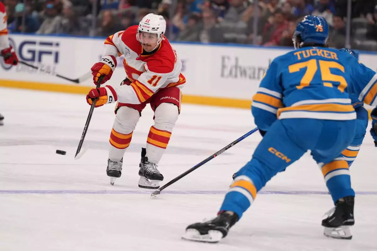 The Blues improved to 6-8-3, good for 15 points. The Flames fell to 4-12-2, good for 10 points.