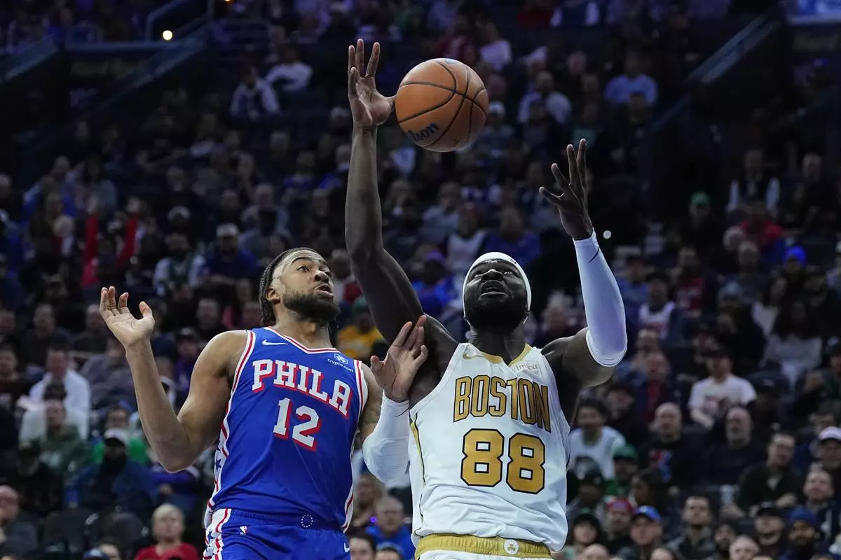 Boston Celtics' Neemias Queta (88) wins the rebound over Philadelphia 76ers' Trendon Watford during the first half of an NBA basketball game Tuesday, Nov. 11, 2025, in Philadelphia. (AP Photo/Matt Rourke)