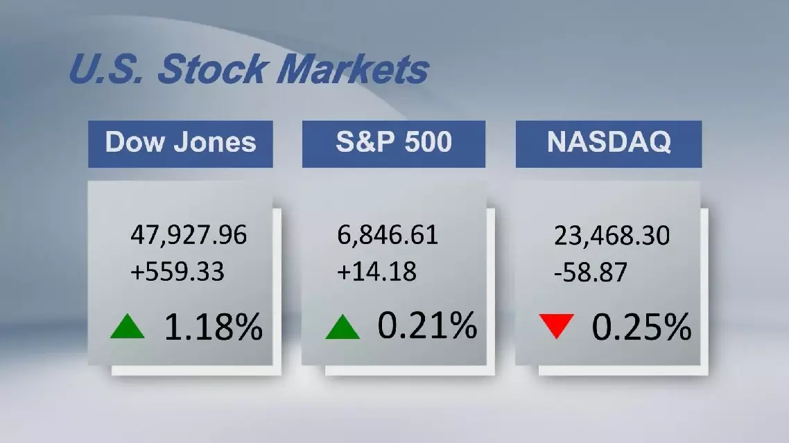 The Dow Jones Industrial Average rose 559.33 points, or 1.18 percent, to 47,927.96. The Standard & Poor's 500 added 14.18 points, or 0.21 percent, to 6,846.61. The Nasdaq Composite Index shed 58.87 points, or 0.25 percent, to 23,468.3.