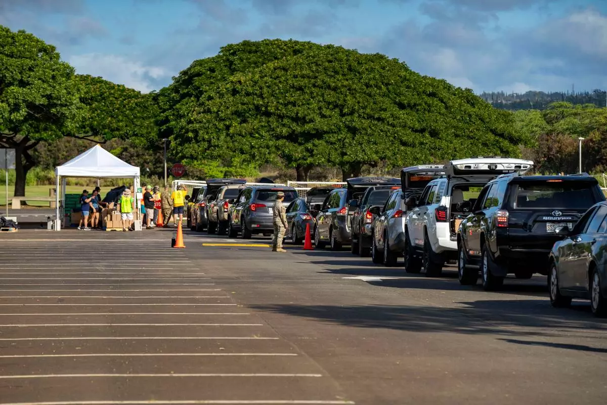 Cars line up for a Hawaii Foodbank pop-up food distribution at Waipio Soccer Complex, Monday, Nov. 10, 2025, in Waipahu, in Honolulu County, Hawaii. (AP Photo/Mengshin Lin)