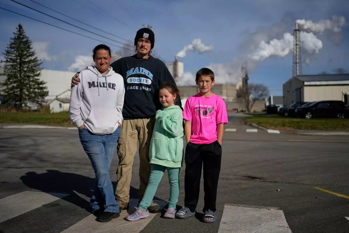 Gerard Berry with his wife Stephanie, and children Brooklynn and Aidan, pose near the Woodland Pulp mill, Friday, Nov. 7, 2025, during a walk in their neighborhood in Baileyville, Maine. (AP Photo/Robert F. Bukaty)