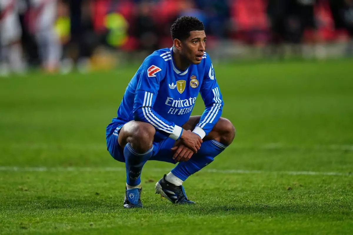 Real Madrid's Jude Bellingham reacts during a Spanish La Liga soccer match between Rayo Vallecano and Real Madrid in Madrid, Spain, Sunday, Nov. 9, 2025. (AP Photo/Manu Fernandez)