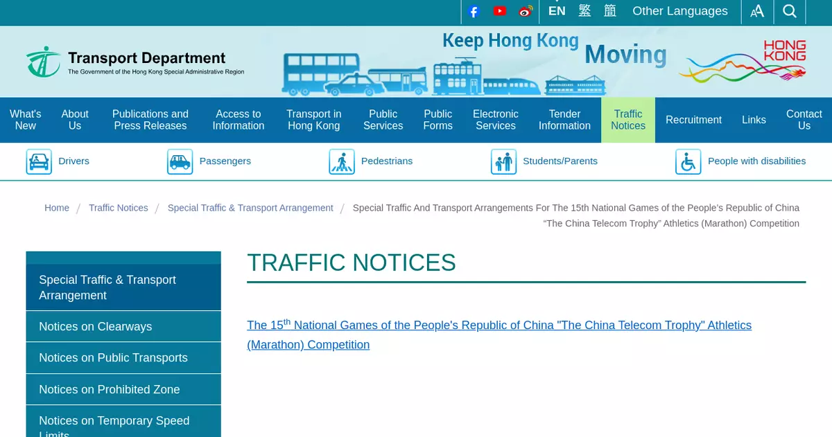 For details of the special traffic and transport arrangements for the Athletics (Marathon) Competition and triathlon event, members of the public may refer to the TD's relevant notices (Athletics (Marathon) Competition: www.td.gov.hk/en/traffic_notices/index_id_83680.html; triathlon event: https://www.td.gov.hk/en/traffic_notices/index_id_83698.html), its mobile application "HKeMobility", and passenger notices issued by the relevant public transport operators.