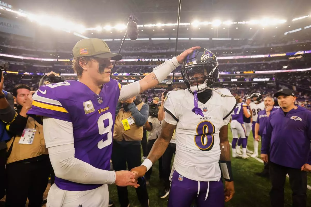 Baltimore Ravens quarterback Lamar Jackson (8) greets Minnesota Vikings quarterback J.J. McCarthy (9) after an NFL football game, Sunday, Nov. 9, 2025, in Minneapolis. (AP Photo/Bruce Kluckhohn)