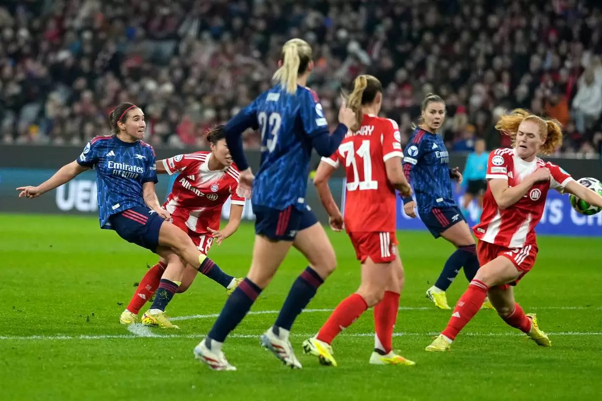 Arsenal's Mariona Caldentey, left, scores her side's second goal during the women's Champions League opening phase soccer match between FC Bayern Munich and Arsenal FC in Munich, Germany, Wednesday, Nov. 12, 2025. (AP Photo/Matthias Schrader)