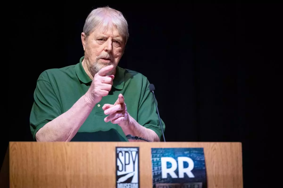 Kryptos artist Jim Sanborn speaks during press conference at the International Spy Museum, Wednesday, Nov. 12, 2025 in Washington. (AP Photo/Kevin Wolf)