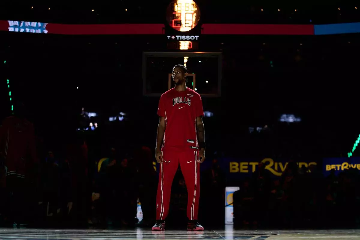 Chicago Bulls forward Dalen Terry stands on the court before an NBA basketball game against the Detroit Pistons, Wednesday, Nov. 12, 2025, in Detroit. (AP Photo/Ryan Sun)