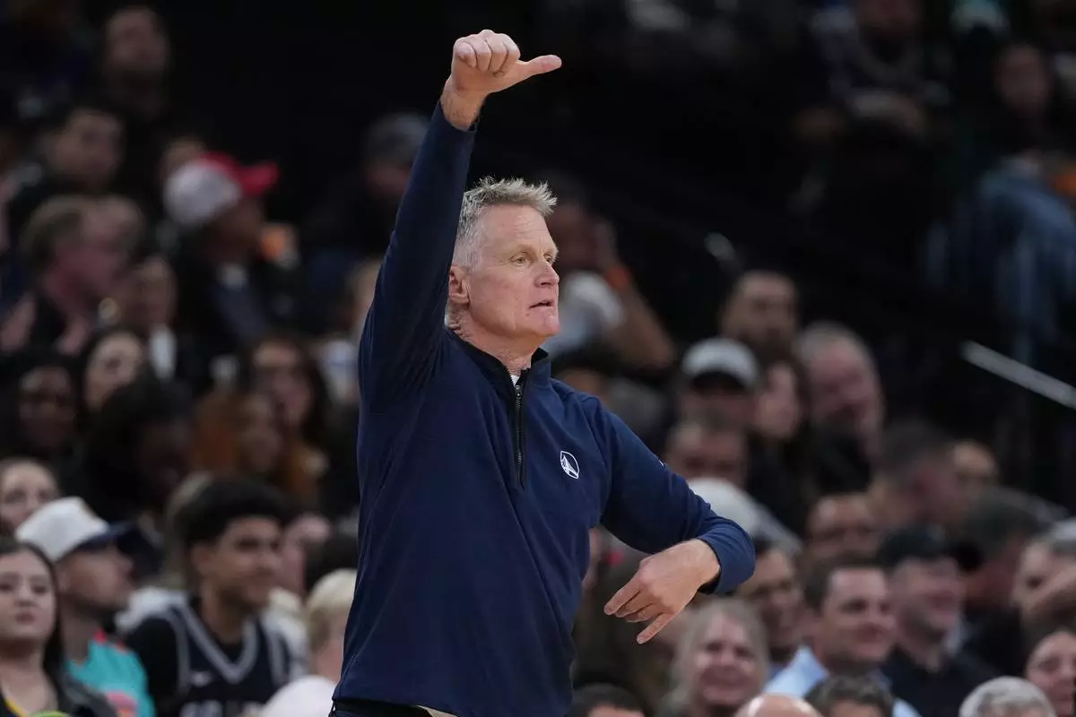 Golden State Warriors head coach Steve Kerr signals to his players during the second half of an NBA basketball game against the San Antonio Spurs in San Antonio, Wednesday, Nov. 12, 2025. (AP Photo/Eric Gay)