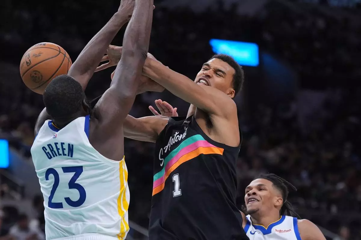 San Antonio Spurs forward Victor Wembanyama (1) is fouled by Golden State Warriors forward Draymond Green (23) during the second half of an NBA basketball game in San Antonio, Wednesday, Nov. 12, 2025. (AP Photo/Eric Gay)