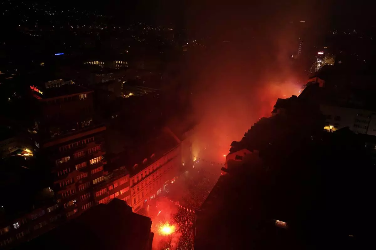 An aerial view shows fans celebrating after the Bosnian national team qualified for the World Cup by winning a penalty shootout against Italy, in Sarajevo, Bosnia, Wednesday, April 1, 2026. (AP Photo/Armin Durgut)