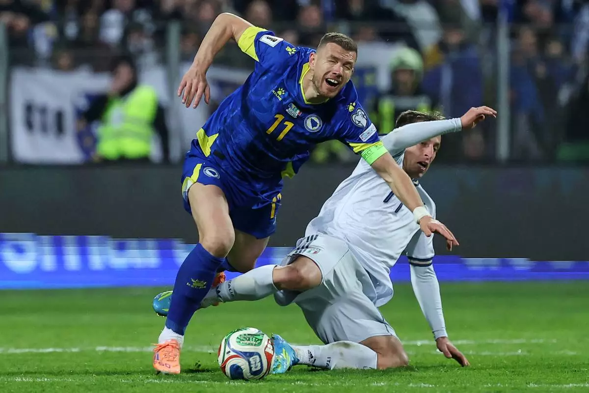 Bosnia's Edin Dzeko, left, is challenged by Italy's Davide Frattesi during the World Cup qualifying playoff final soccer match between Bosnia and Italy in Zenica, Bosnia, Tuesday, March 31, 2026. (AP Photo/Armin Durgut)