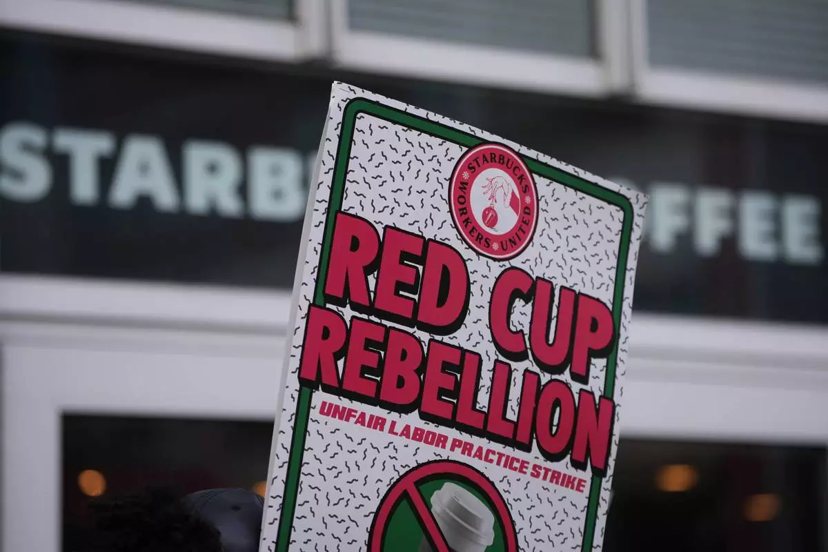 A protester sign is seen during a picket outside a Starbucks, Thursday, Nov. 13, 2025, in Philadelphia. (AP Photo/Matt Slocum)