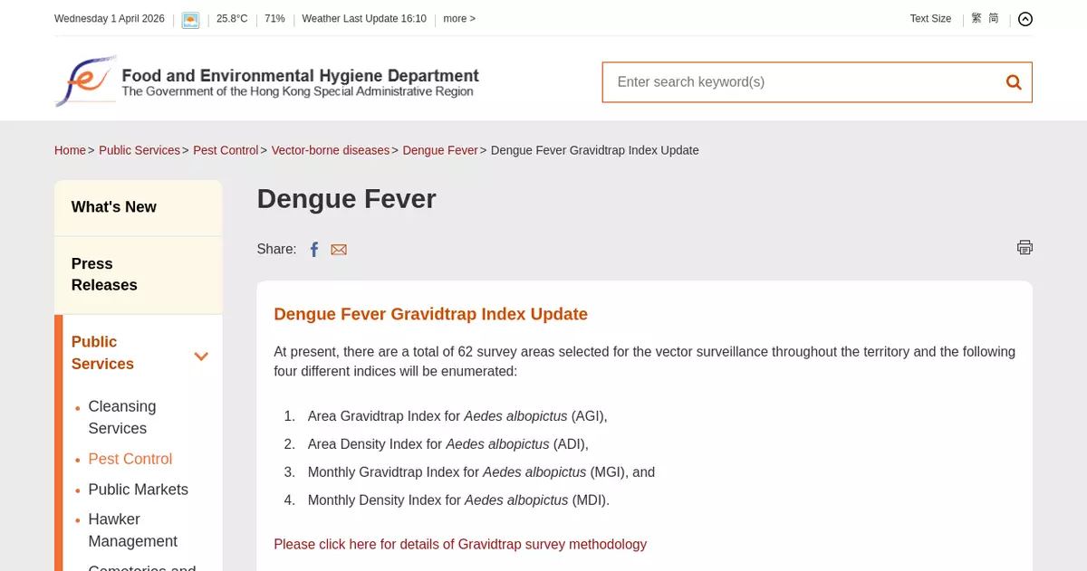 Starting in August 2025, following the completion of the surveillance of individual survey areas, and once the latest gravidtrap index and the density index are available, the FEHD has been disseminating relevant information through press releases, its website and social media. It aims to allow members of the public to quickly grasp the mosquito infestation situation and strengthen mosquito control efforts, thereby reducing the risk of chikungunya fever (CF) transmission.