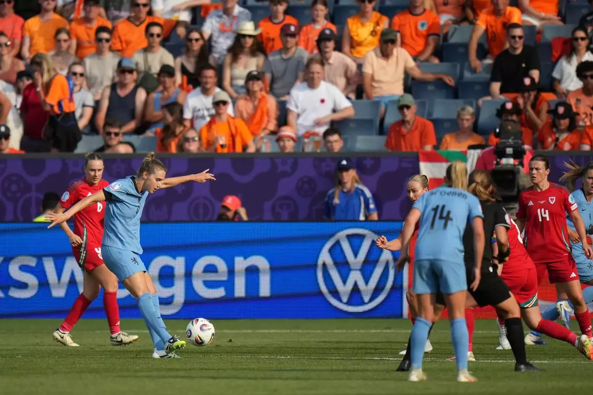 FILE - Netherlands' Vivianne Miedema scores his side's opening goal during the Euro 2025 group D soccer match between Wales and the Netherlands at Allmend Stadion Luzern in Lucerne, Switzerland, July 5, 2025. (AP Photo/Alessandra Tarantino, File)