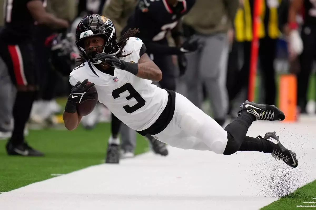 Jacksonville Jaguars wide receiver Jakobi Meyers (3) leaps during the second half of an NFL football game against the Houston Texans, Sunday, Nov. 9, 2025, in Houston. (AP Photo/Eric Christian Smith)
