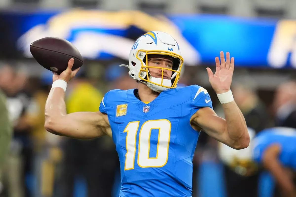 Los Angeles Chargers quarterback Justin Herbert (10) warms up before the team's NFL football game against the Pittsburgh Steelers Sunday, Nov. 9, 2025, in Inglewood, Calif. (AP Photo/Marcio Jose Sanchez)